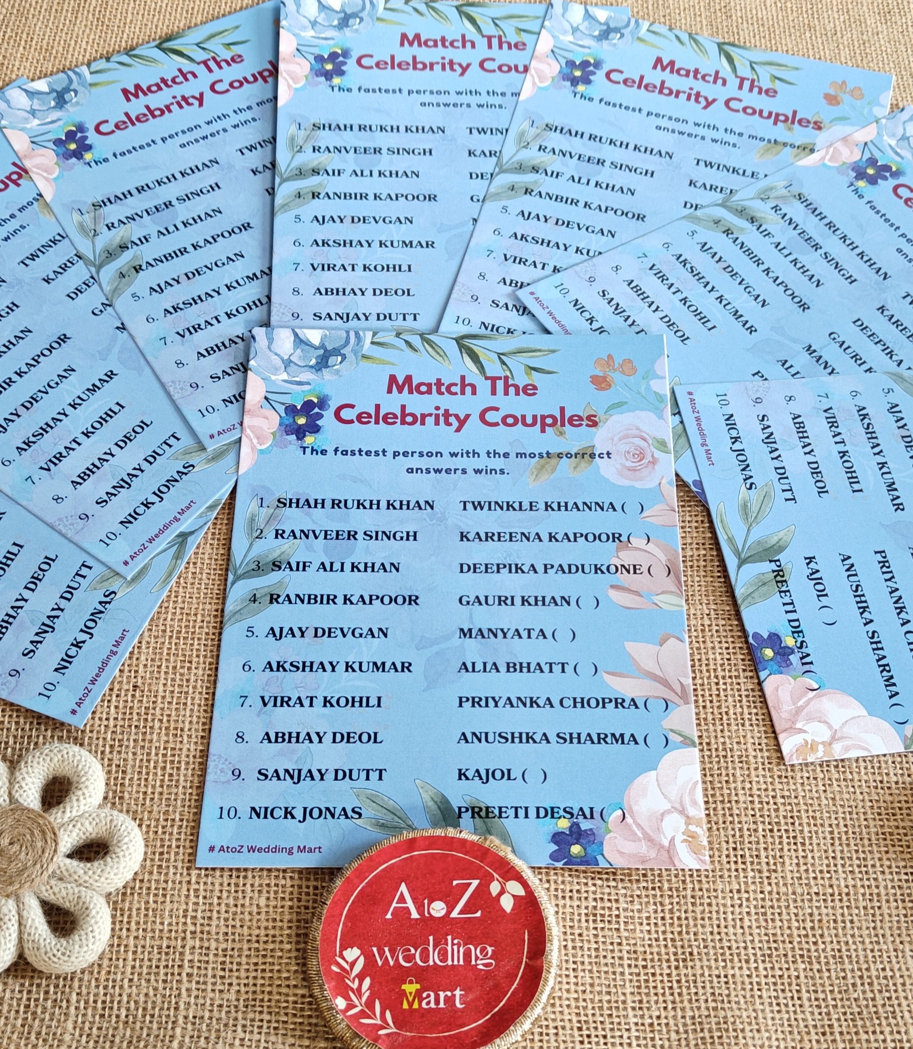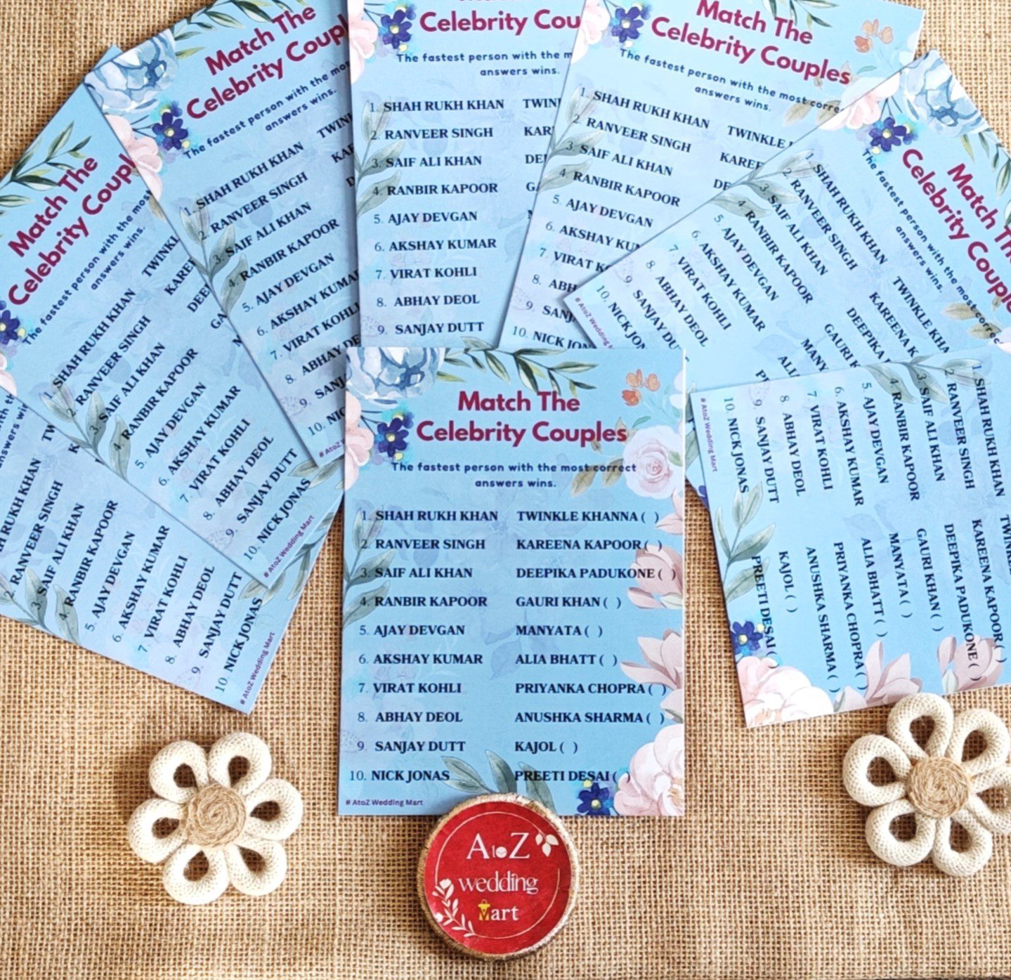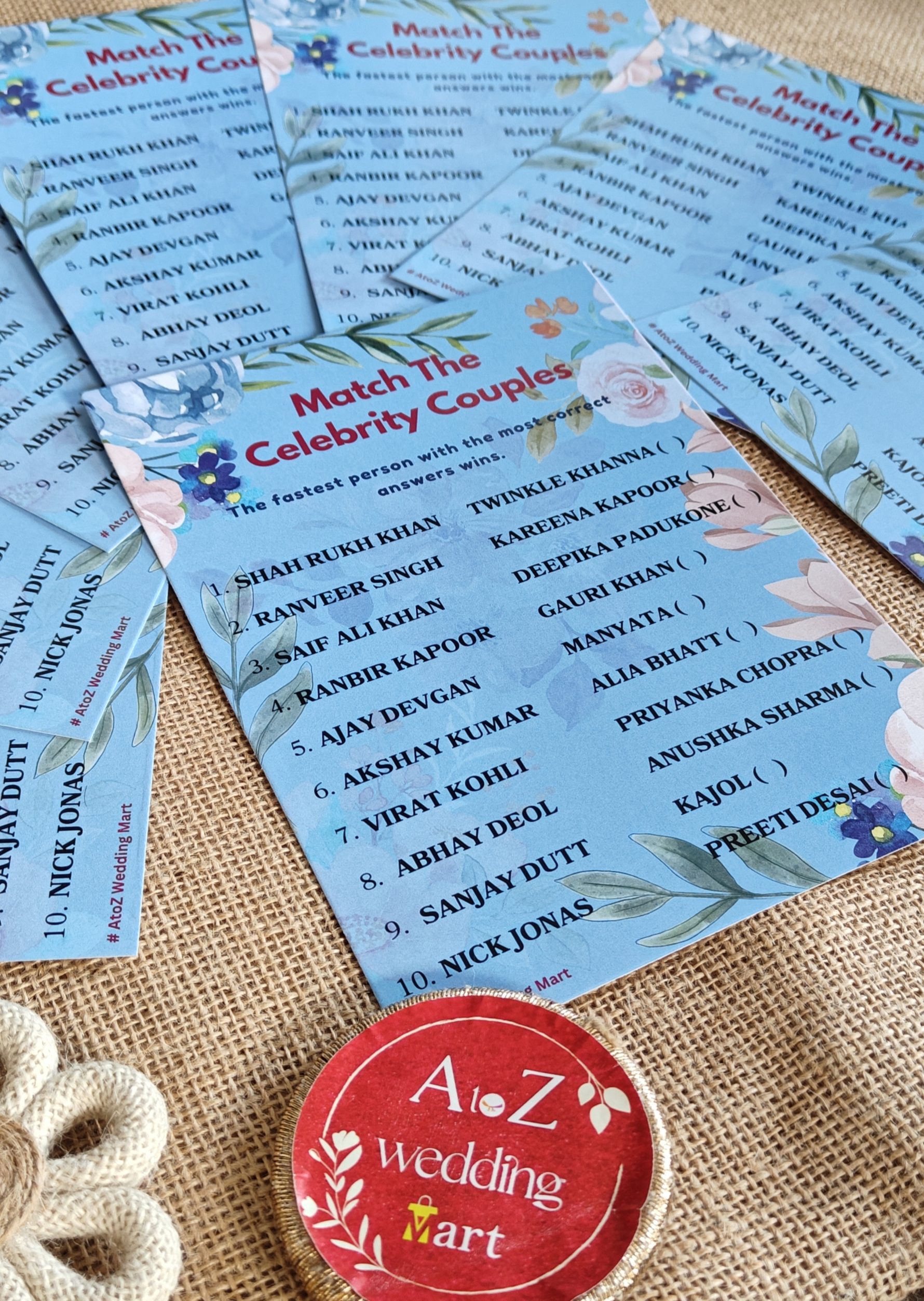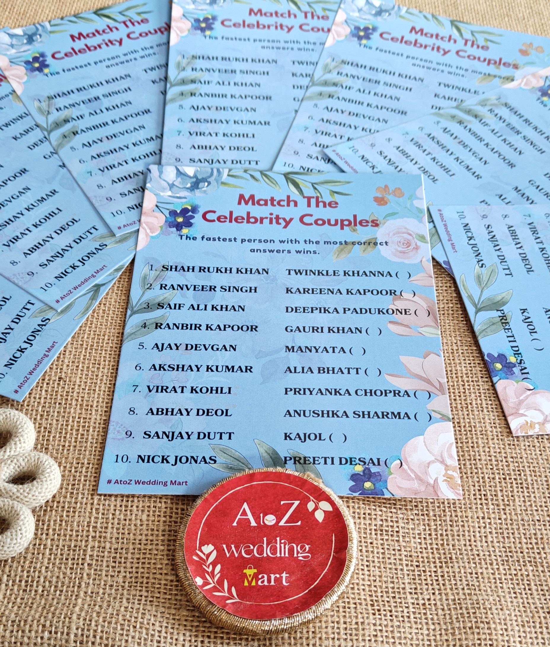 Add a spark of entertainment to your wedding or sangeet night with our “Match the Celebrity Couple” game tickets! These beautifully designed tickets are perfect for engaging guests of all ages as they test their Bollywood and Hollywood knowledge. Each ticket challenges players to match famous celebrity pairs, bringing a fun, competitive twist to your celebrations. Ideal for lively gatherings, these game tickets make your wedding festivities even more memorable, allowing guests to interact, laugh, and bond over shared knowledge of iconic couples. Perfect for breaking the ice and creating unforgettable moments!