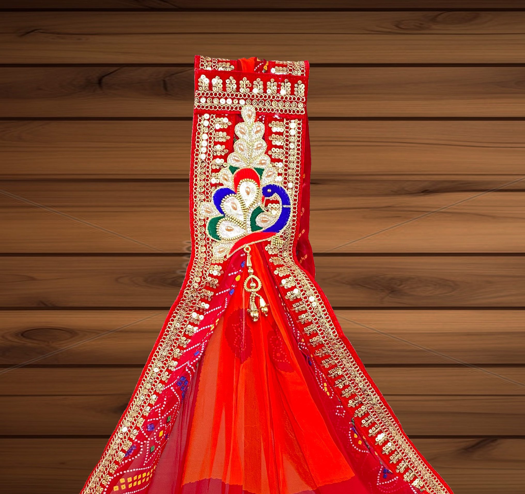 The intricate detailing and luxurious feel of this bridal dupatta make it an essential addition to any wedding ensemble. Whether paired with a traditional saree or a modern lehenga, the rich red hue and plated stole-set elevate any look, adding a regal touch to your outfit. The pallhu odhana and carefully crafted accessories further enhance its beauty, making it a versatile piece for any ethnic wardrobe.