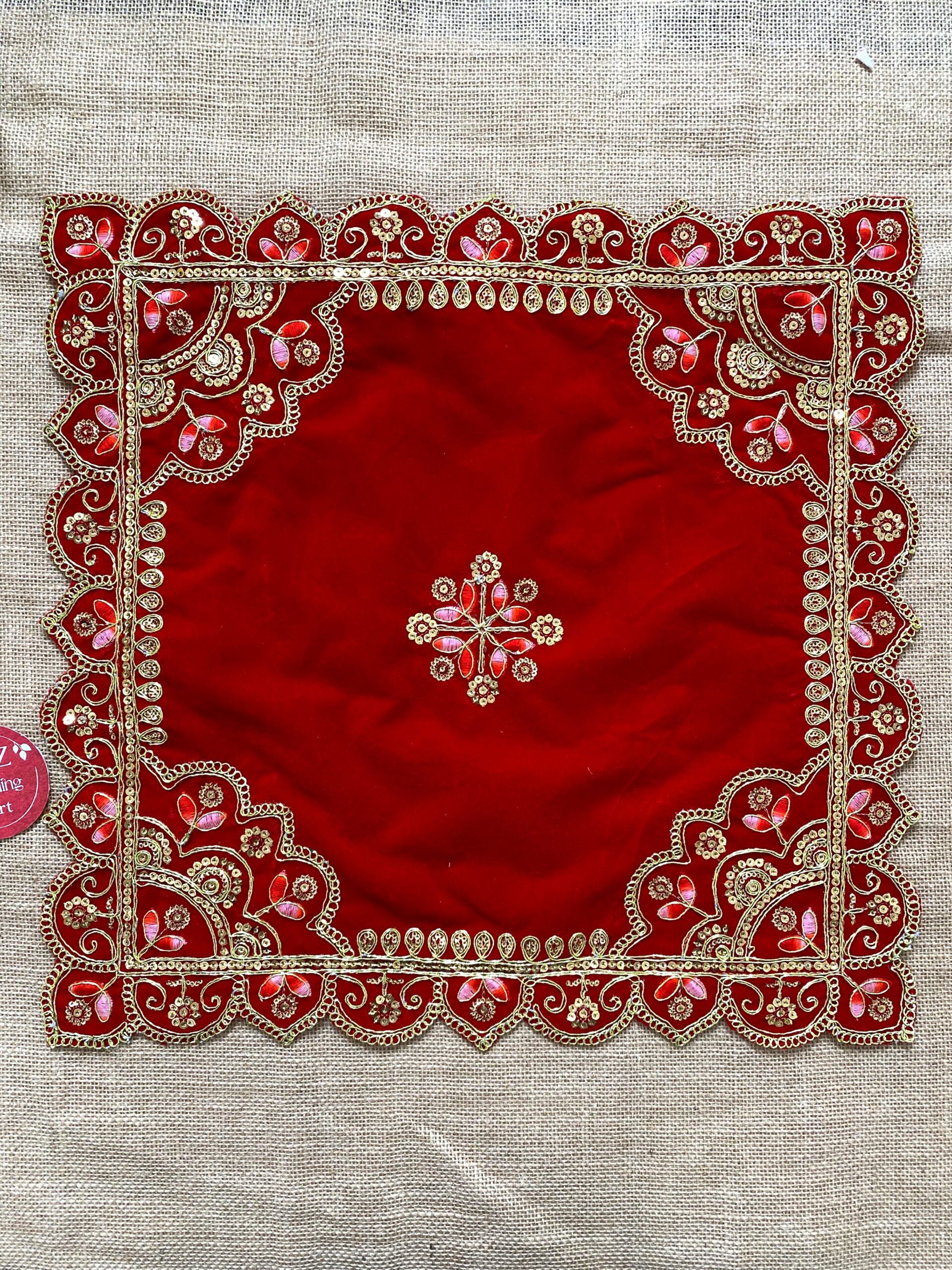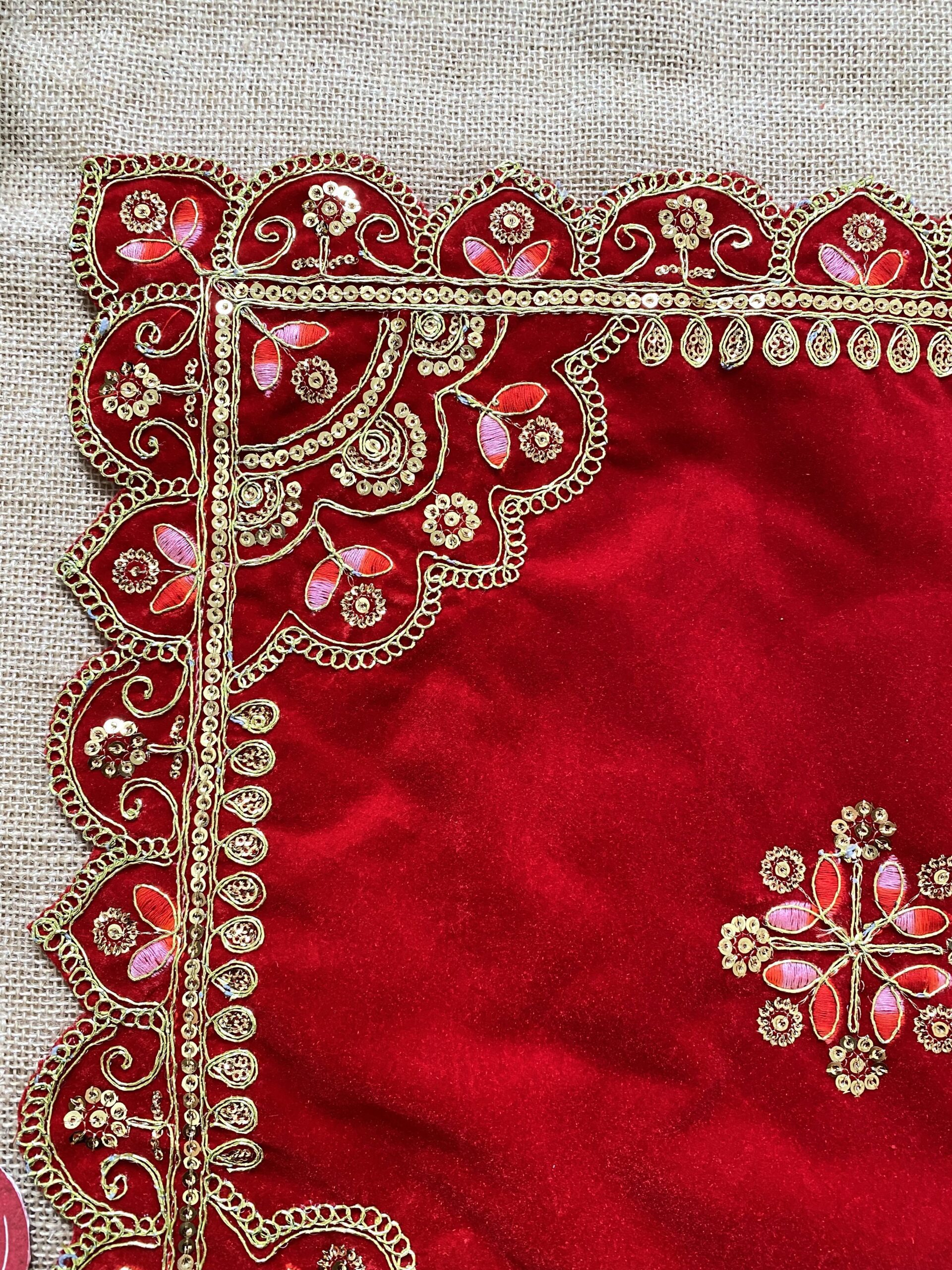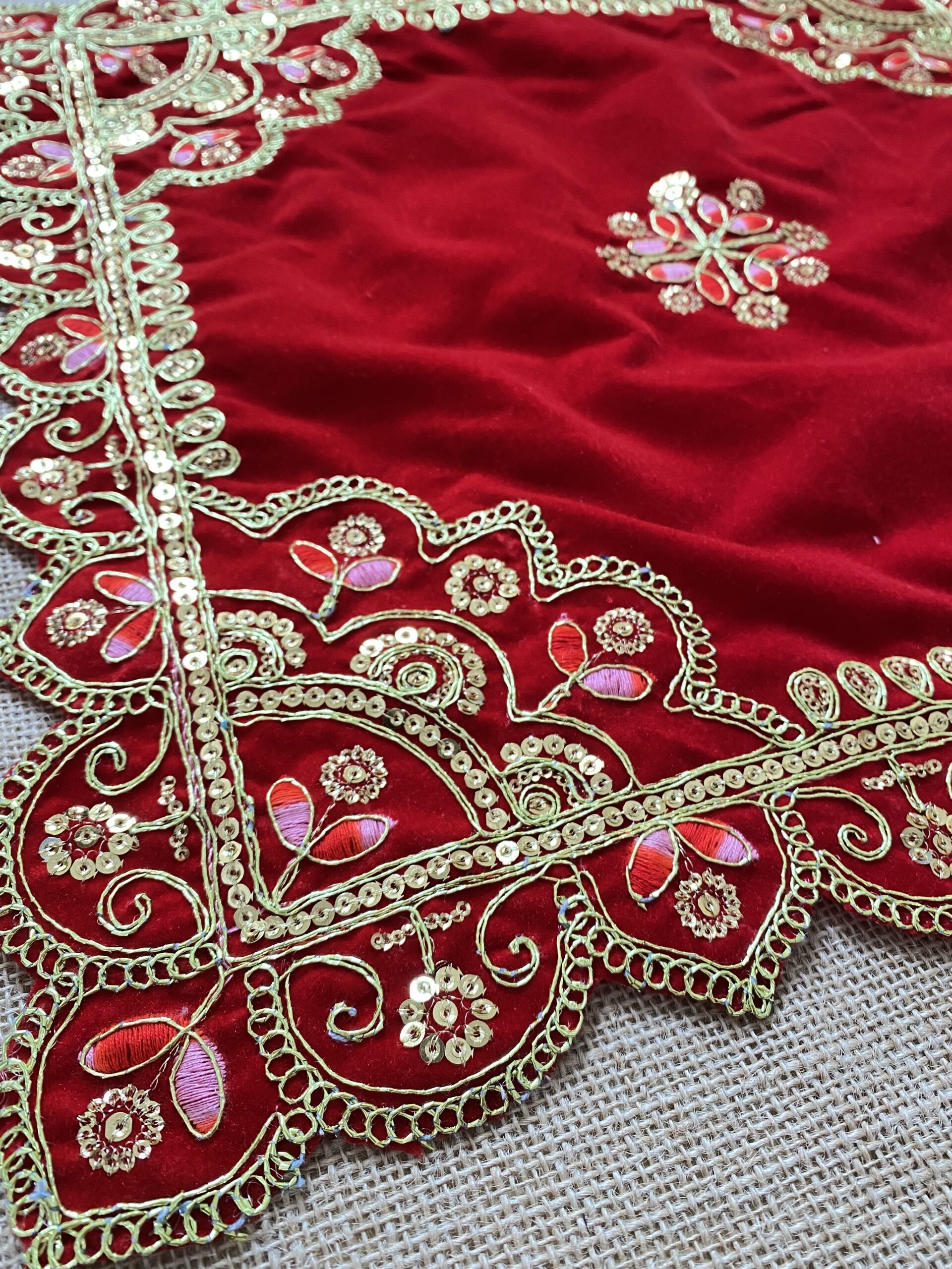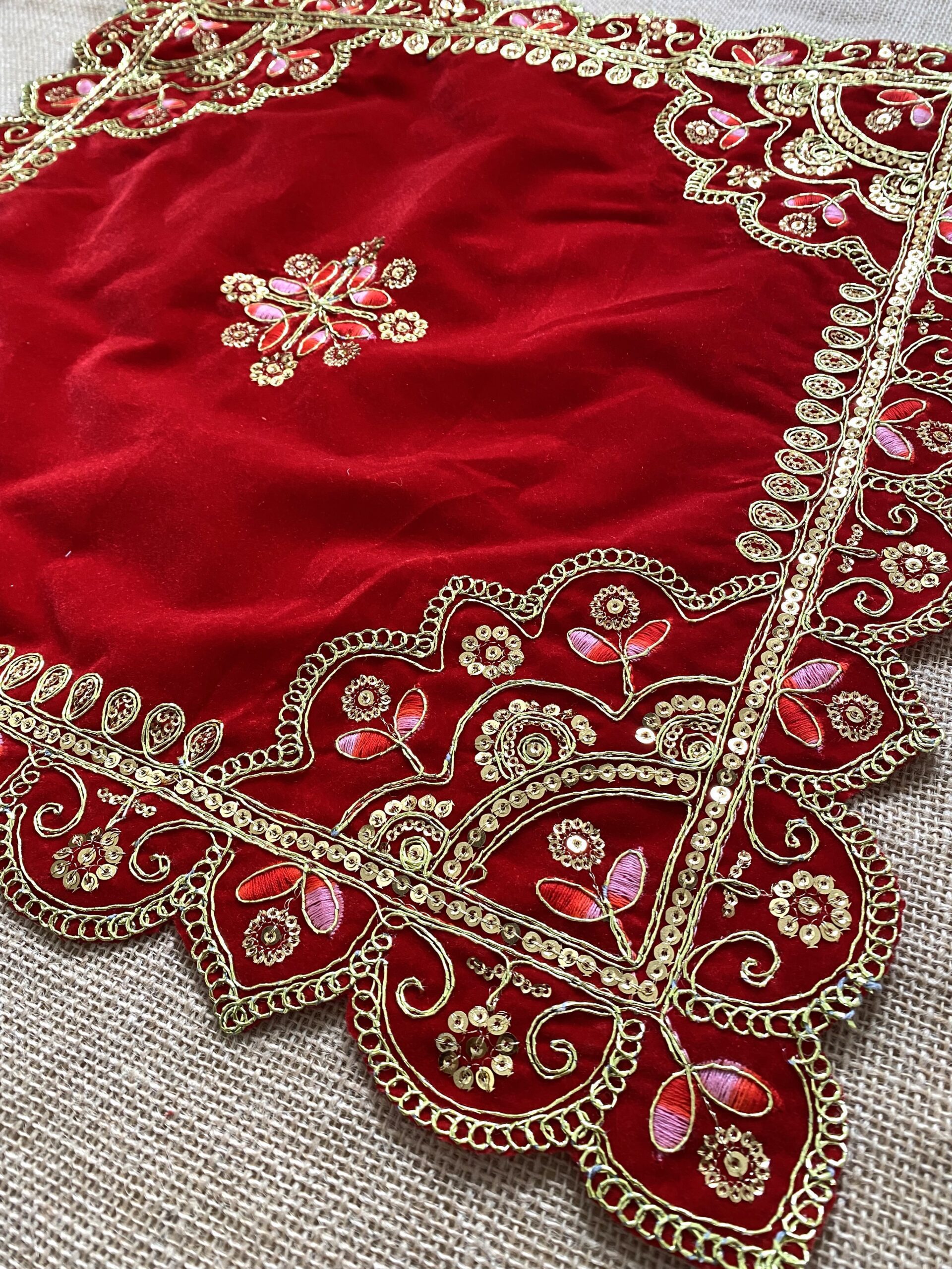 The velvet fabric not only offers a soft, sumptuous texture but also ensures durability, allowing it to maintain its elegance through repeated ceremonial use. The embroidery is skillfully attached to provide a vibrant and intricate design that stays intact, ensuring lasting beauty. Whether used as a chowki cover, baithak spread, or pooja altar decor, these aasans transform ordinary spaces into regal settings, elevating the overall ambiance of your event.