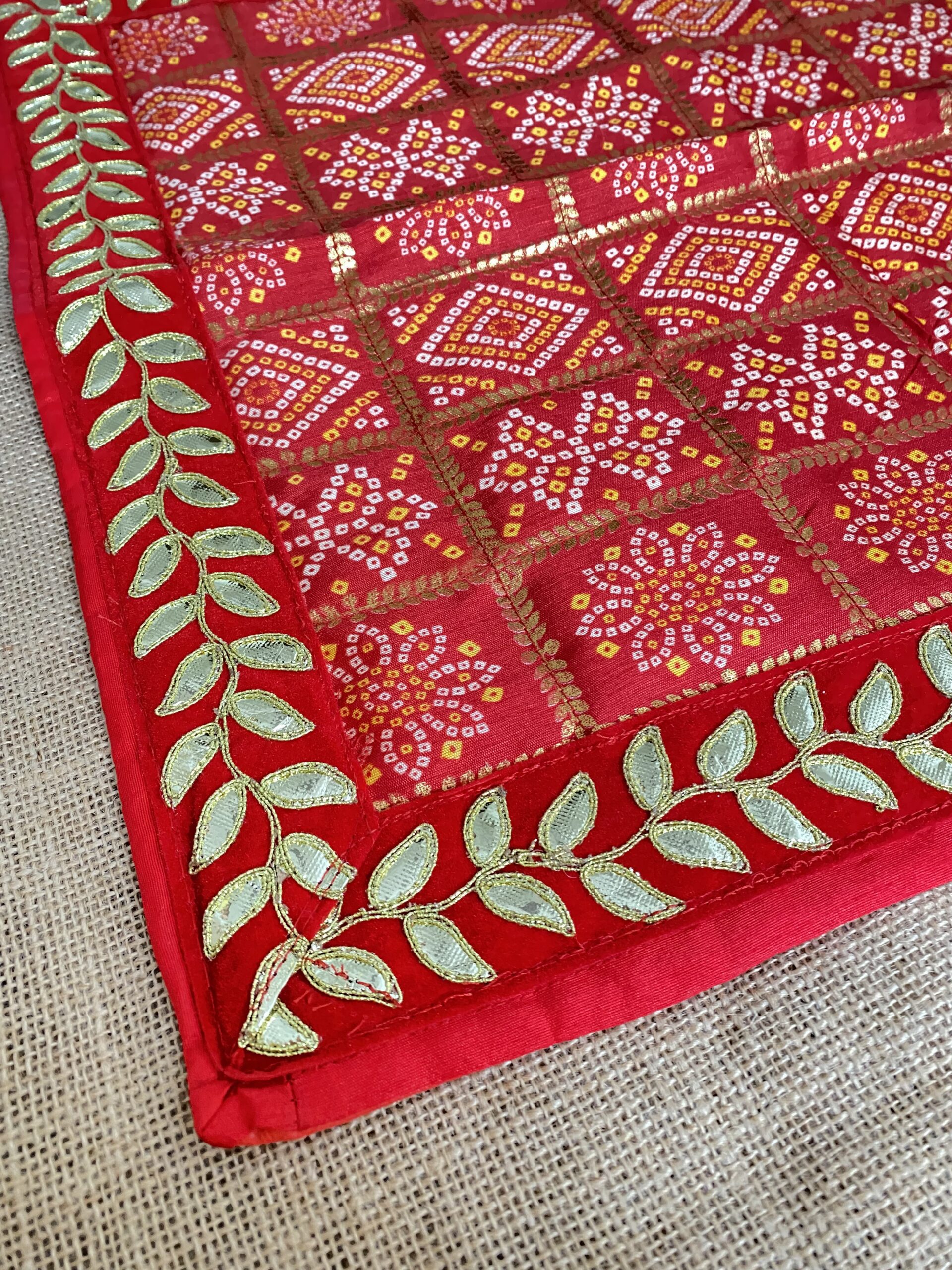 The Gota Patti embroidery is a hallmark of traditional Indian design, characterized by its use of metallic threads and embellishments that create a luxurious and textured finish. This aasan features a rich combination of these elements, meticulously arranged to form a beautiful and eye-catching design. The result is a piece that not only adds aesthetic value but also reflects cultural heritage and artistic excellence.