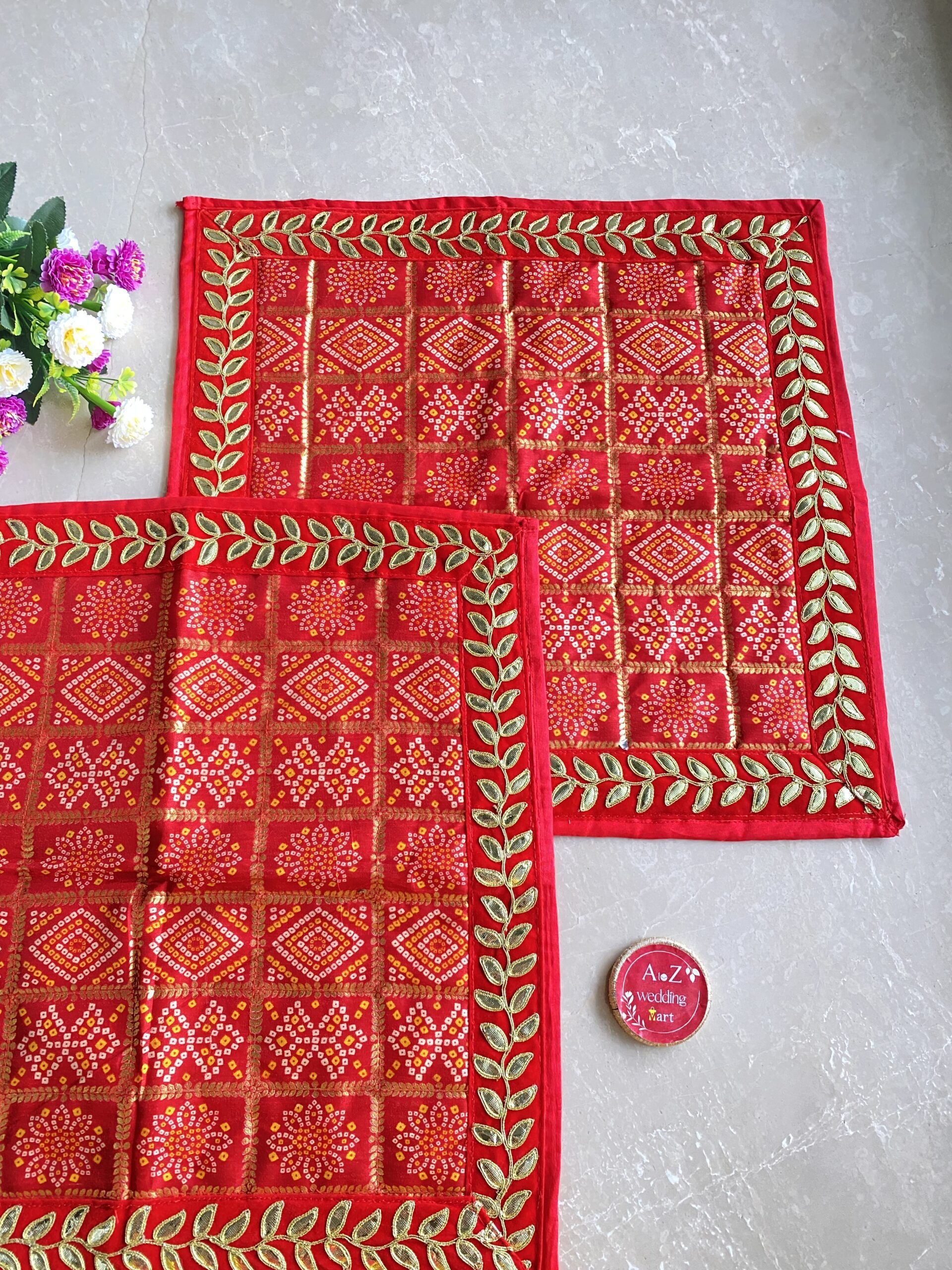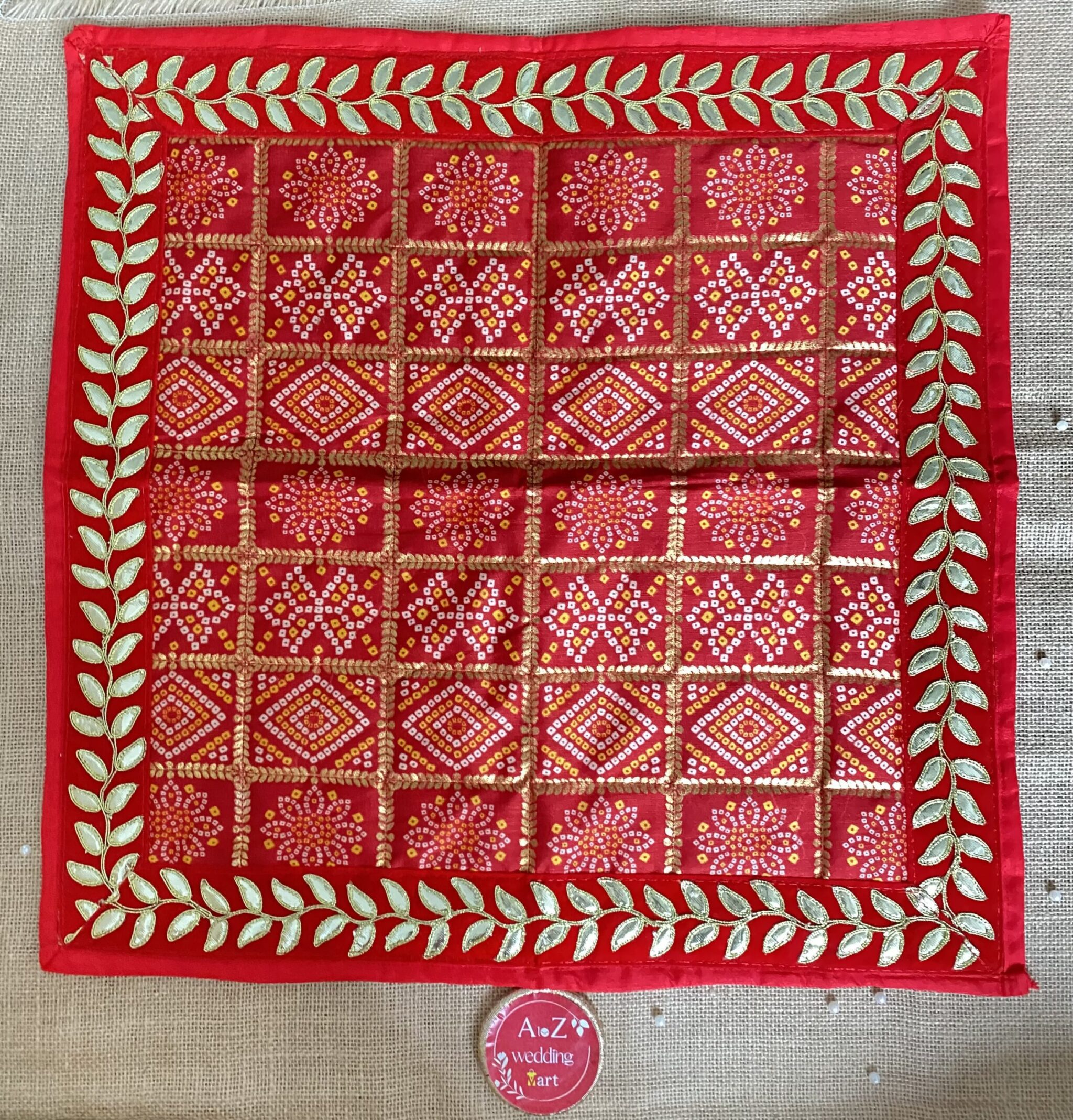 “Introducing our exquisite Gota Patti designer aasan, a stunning blend of traditional artistry and modern elegance, meticulously crafted to enhance your seating arrangements with a regal touch. This aasan stands out for its intricate Gota Patti embroidery, known for its shimmering appeal and detailed craftsmanship. The elaborate patterns and designs, skillfully stitched onto premium fabric, bring a sense of grandeur and sophistication to any occasion.