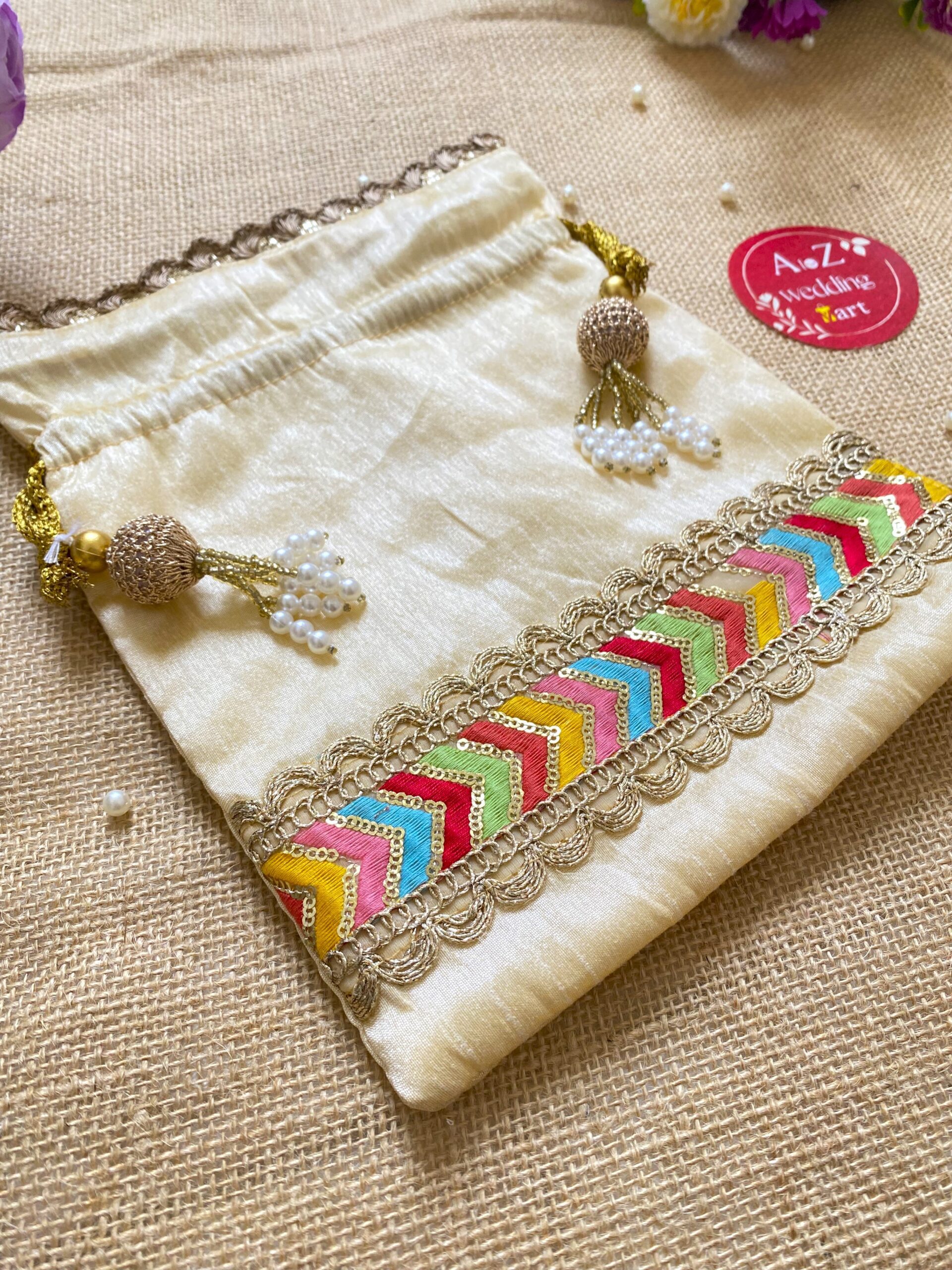 Enhance your celebrations with the elegant charm of our Raw Silk potli pouches with Multicolor Lace. This beautifully crafted potli bag combines the luxurious texture of raw silk with vibrant multicolor lace, making it an exquisite choice for various occasions such as weddings, festivals, and special events.
