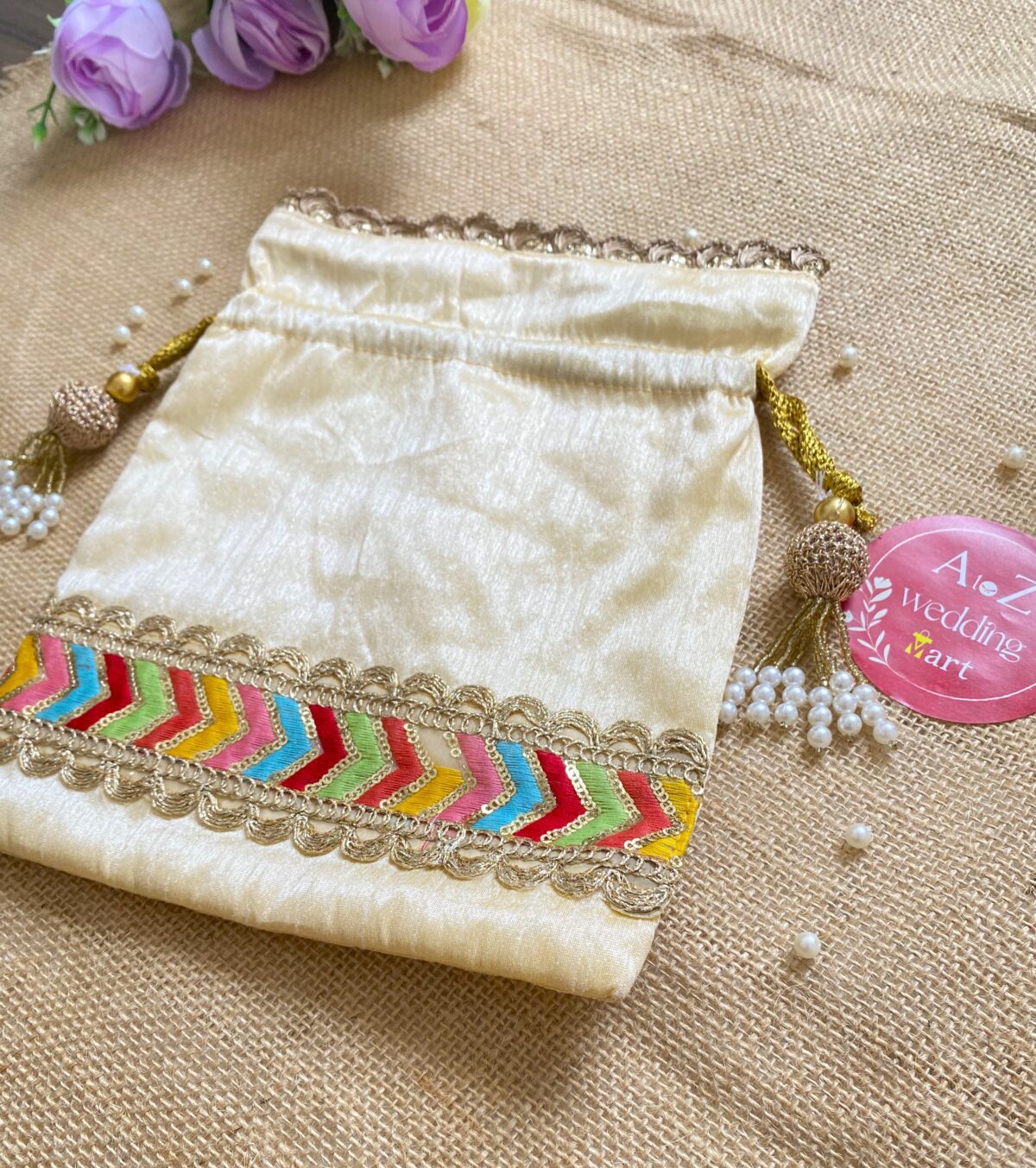 The multicolor lace trim adds a festive touch, making this potli bag an ideal choice for occasions that call for a splash of color and charm. Whether you’re celebrating a wedding, Diwali, Raksha Bandhan, or any special event, this potli pouch combines functionality with style, ensuring that your gifts are presented in an attractive and memorable way.