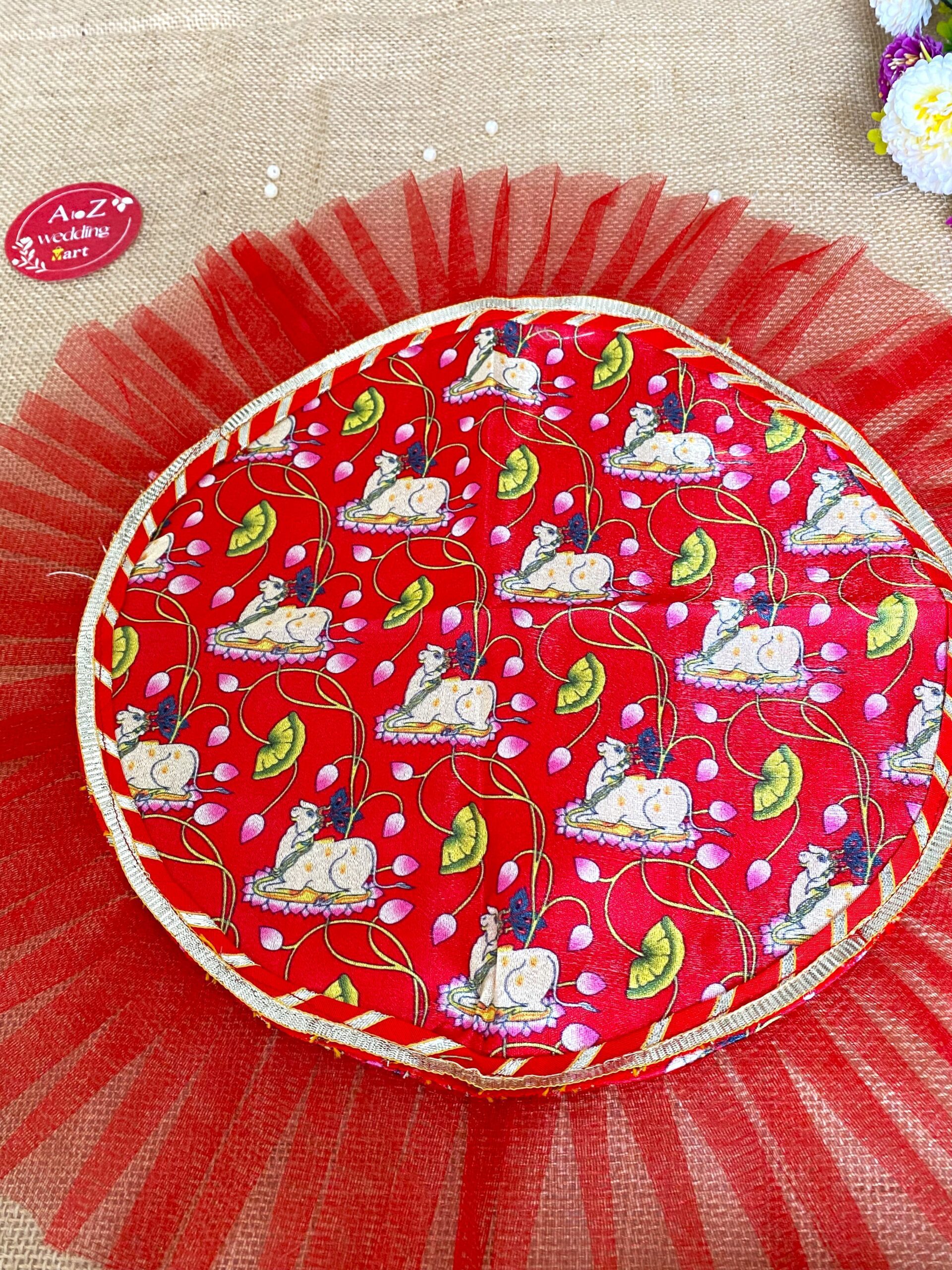 Our Handmade Thaal Posh is designed not only to impress but also to protect. Made from high-quality materials, it offers durability and elegance, ensuring your plates are covered and secure while enhancing the visual appeal of your table. The combination of the Pichwai print with the practical functionality of a plate cover creates a perfect blend of tradition and modernity.