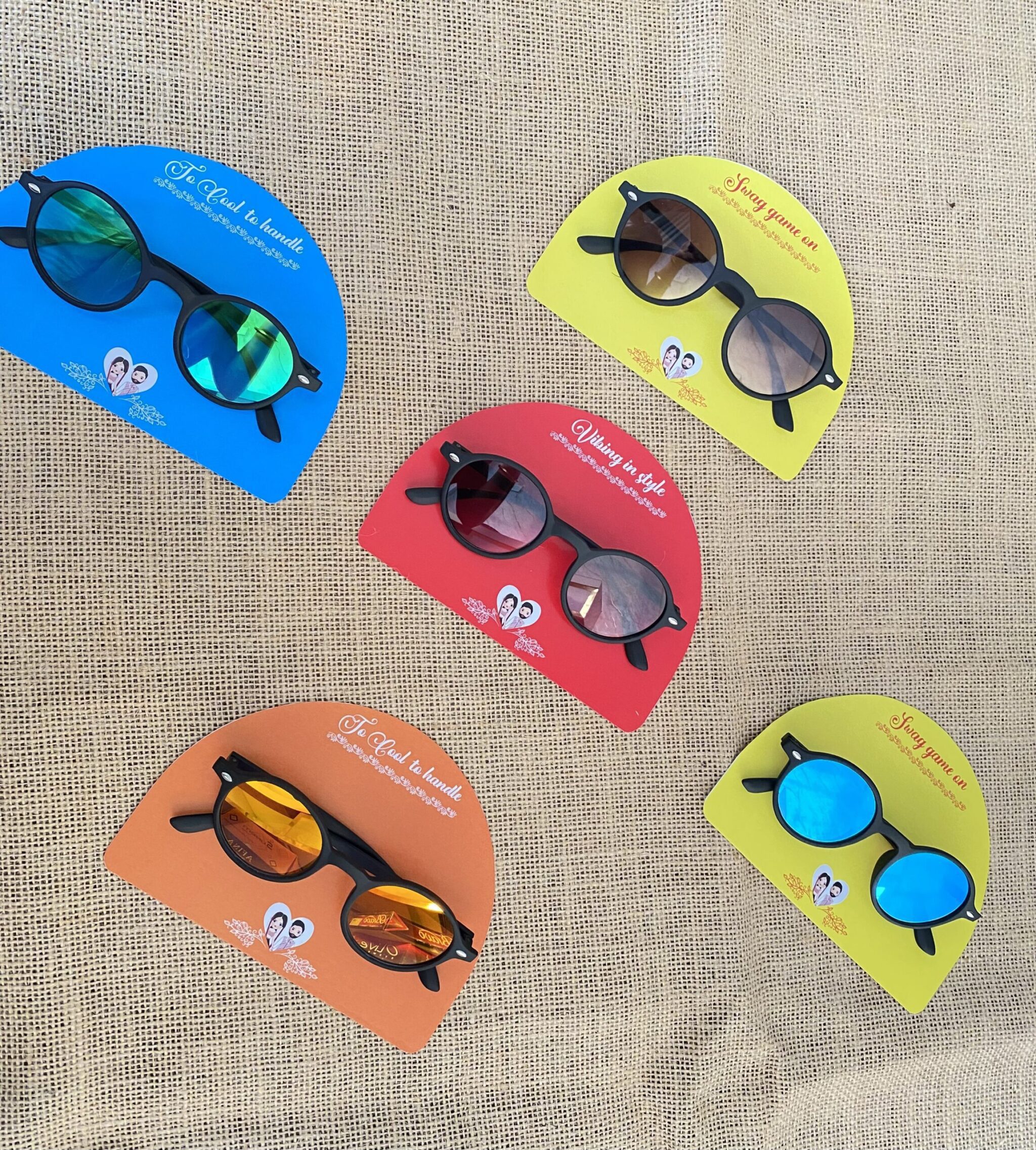 Add a fun and stylish twist to your wedding festivities with our Wedding Party Sunglasses collection! Perfect for Haldi, Mehendi, and poolside parties, these trendy sunglasses are designed to elevate the vibe of your pre-wedding events. Featuring vibrant colors and quirky frames, they bring a playful yet chic look to your celebration.